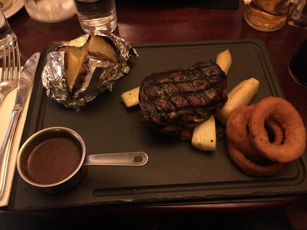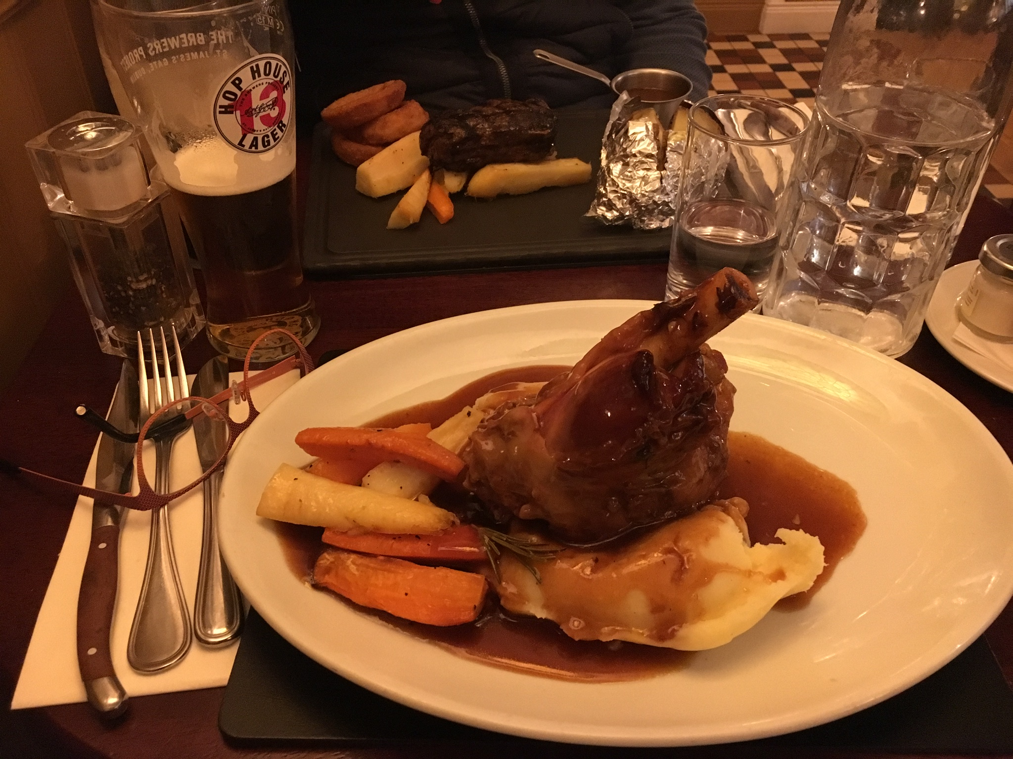 Sirloin Steak, Lammhachse, Irisch Stew…alles probiert und für gut befunden😋. Danach einen echten irische Whiskey (man achte auf das e vor dem y, die Schotten schreiben den Whisky ohne e) und natürlichen einen alten Jameson.