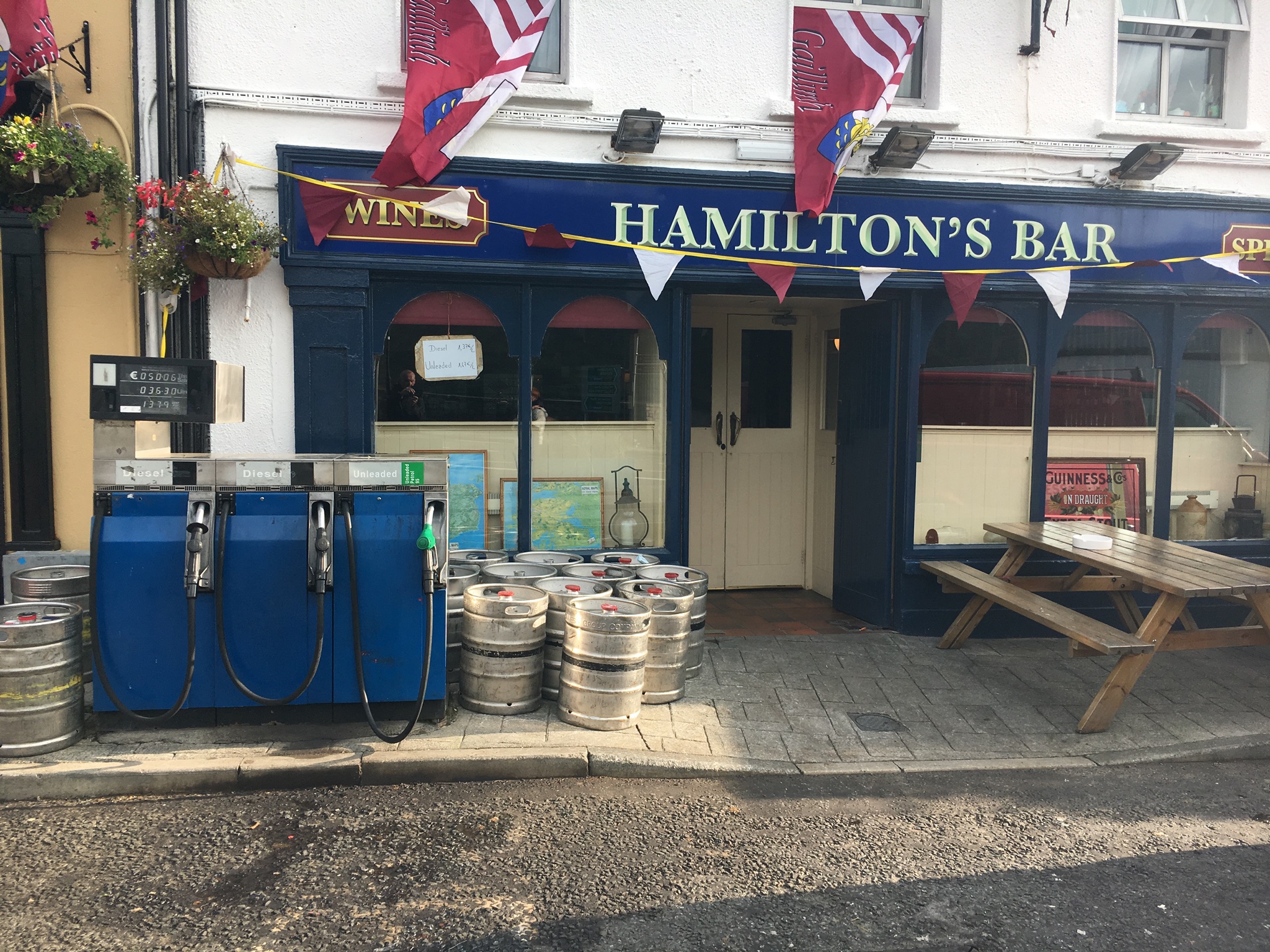 In Leenane, unserem Zielort, hat Tanken offensichtlich eine zweifache Bedeutung, wie man den Bildern entnehmen kann. Neben den 3 Zapfsäulen eine Reihe von Bierfässern. In Hamiltons Bar haben wir dann auch getankt: Hop House Lager, lecker 😋