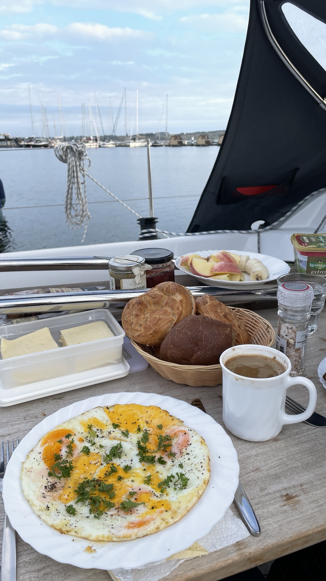 Gager hat uns nicht lange festgehalten. Nach dem Aufstehen stellten wir fest, dass die Servicebatterie ziemlich down war. Sollte der Kühlschrank über Nacht die Batterie leer gesaugt haben? Eigentlich sollte das nicht so sein. Wir haben hier an Board allerdings Null Komma Null Info über die Technik. Also Frühstück und Motor an. Zwei Fliegen mit einer Klappe: Motor macht warm Wasser und Lichtmaschine lädt Batterie.