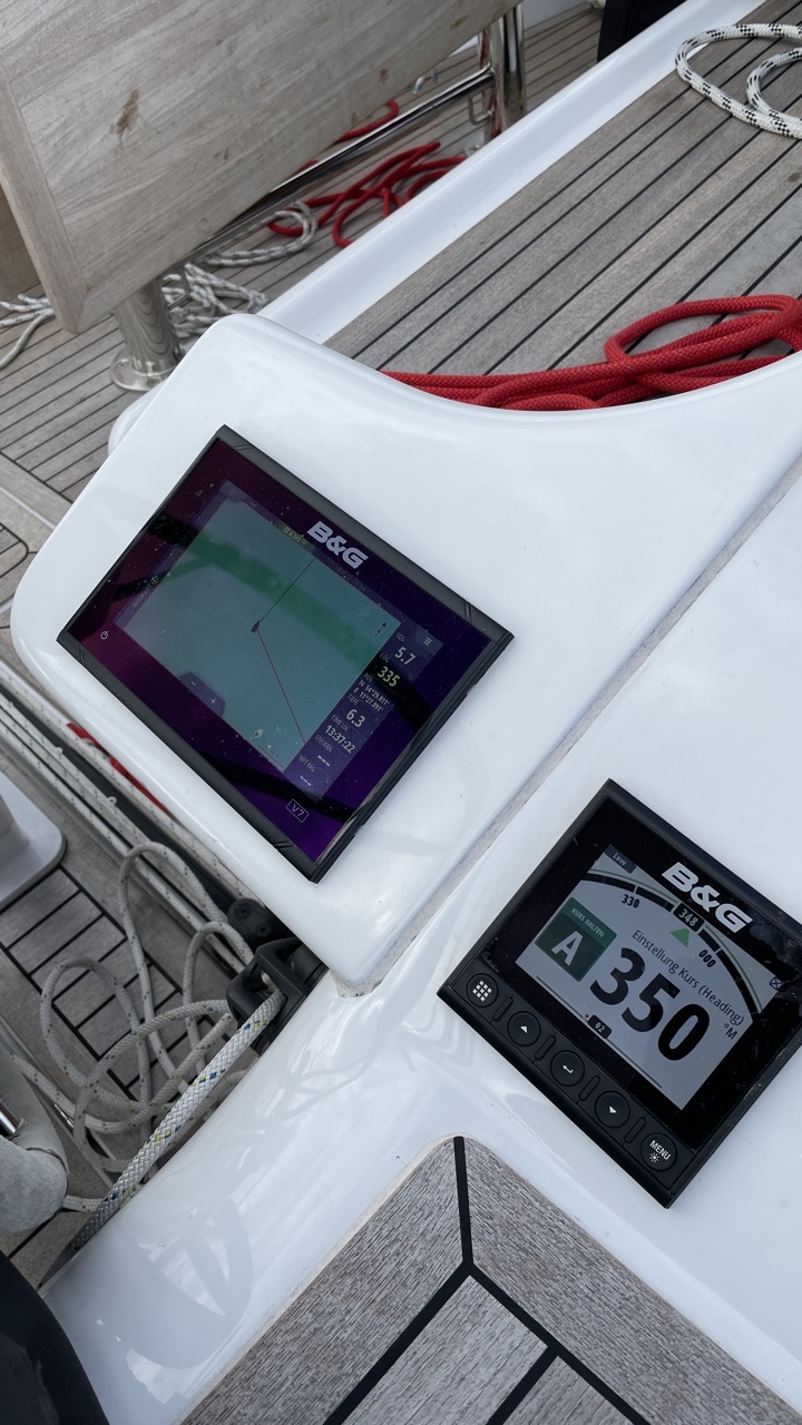 Mein Highlight: der Autopilot. Einmal eingestellt, hält die Yacht den gewählten Kurs wie von Zauberhand. Toller Komfort. Ich stelle mir gerade vor, ohne den Autopiloten von Breege bis Sassnitz zu segeln. keine Minute Ruhe zu haben, angestrengt den Kurs im Blick zu haben, jede Windböe auszugleichen, oder das Segel setzen und -einholen Jane komplett allein zu überlassen, oder oder…. So wird das Ganze wirklich zu einem entspannten Segeltörn.